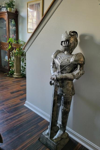 “Sir Percy.” My parents obtained me this four-foot aluminum knight in Cape May, NJ. The story I was told of my stepfather hauling him all over the resort is a family treasure in itself. Percy is the middle name of my grandfather, with whom I had a deep bond and who predicted to me at his kitchen table when I was 12 and already burrowed into Stephen King novels, I would become a writer one day. Sir Percy has served as protector of my realm in 7 homes.