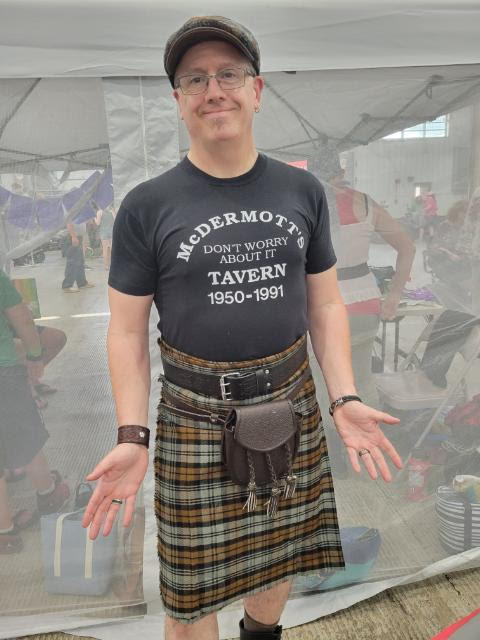 I upgraded my kilt and decided to re-try an old look I gave up on, the flat cap. TJ was most pleased by the flat cap, but better yet, she sold out of everything except for a handful of coloring books!