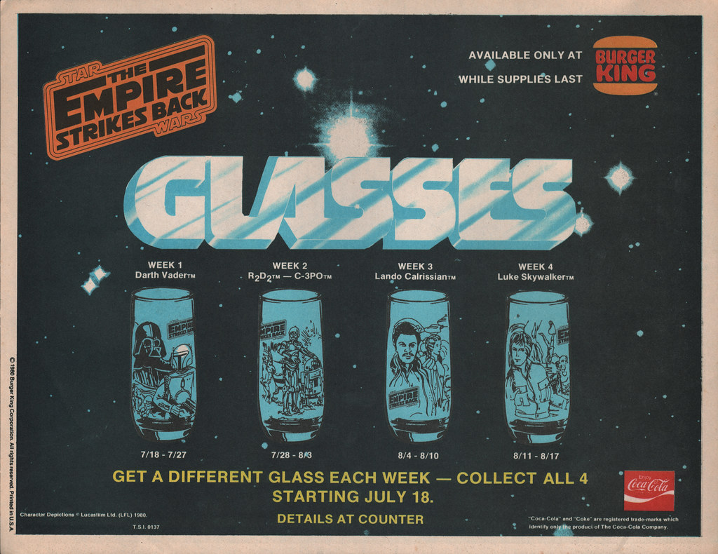 When The Empire Strikes Back was out, I would harass my father to take me to Burger King every Saturday when a new glass in that cycle arrived. It took us no time to collect the glasses for Lando Calrissian/Princess Leia, Luke Skywalker and Yoda (which I still have) and our droid pals, Artoo and Threepio in a bipolar icy climate on Hoth.