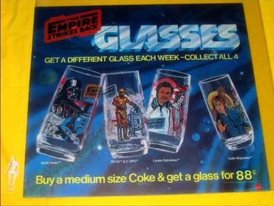 In the end, I never got that Vader/Fett glass and I let my dad off the hook after exhausting his patience. As I got older, I thought about that glass, but it became a whatever thing for me, as I pared down and purged most of my collections over time. Sidebar, if you can get your head around it, to snag a glass back then, you only needed to buy a medium Coke for .88 cents!!!
