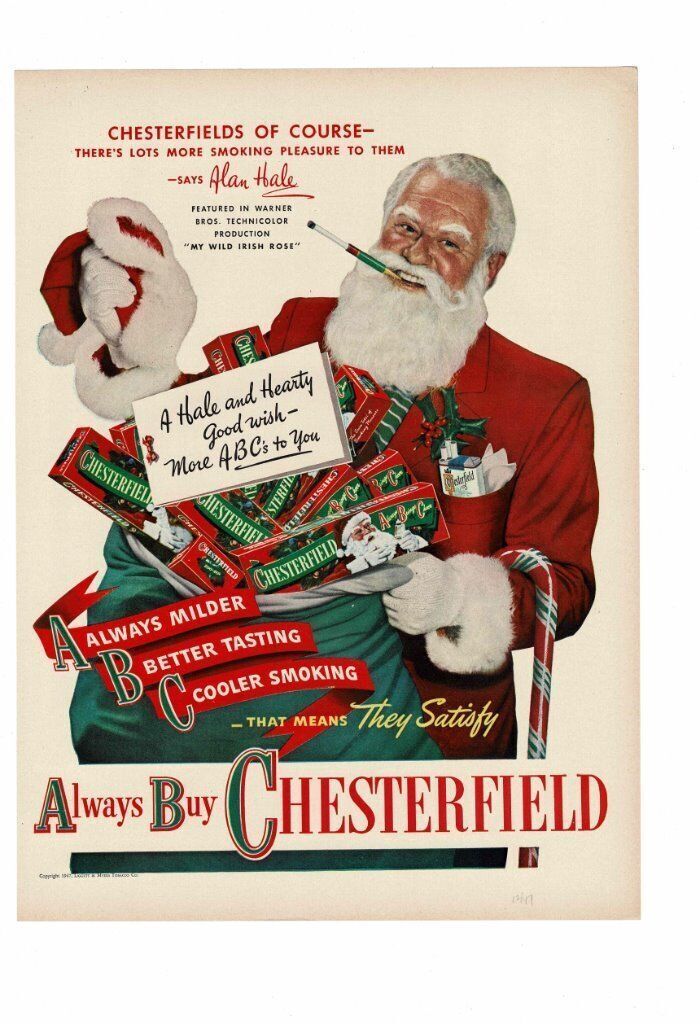 I mean, even Alan Hale, aka “The Skipper” in Gilligan’s Island, once did a bit in cosmopolitan Santa Drag to hawk Chesterfields. Chesterfield also utilizing a little ABC motif to create a tongue-waggling, Pavlovian buzz phrase, “Always Buy Chesterfield.” Hit ’em all, no matter the age bracket, current and future customers alike.