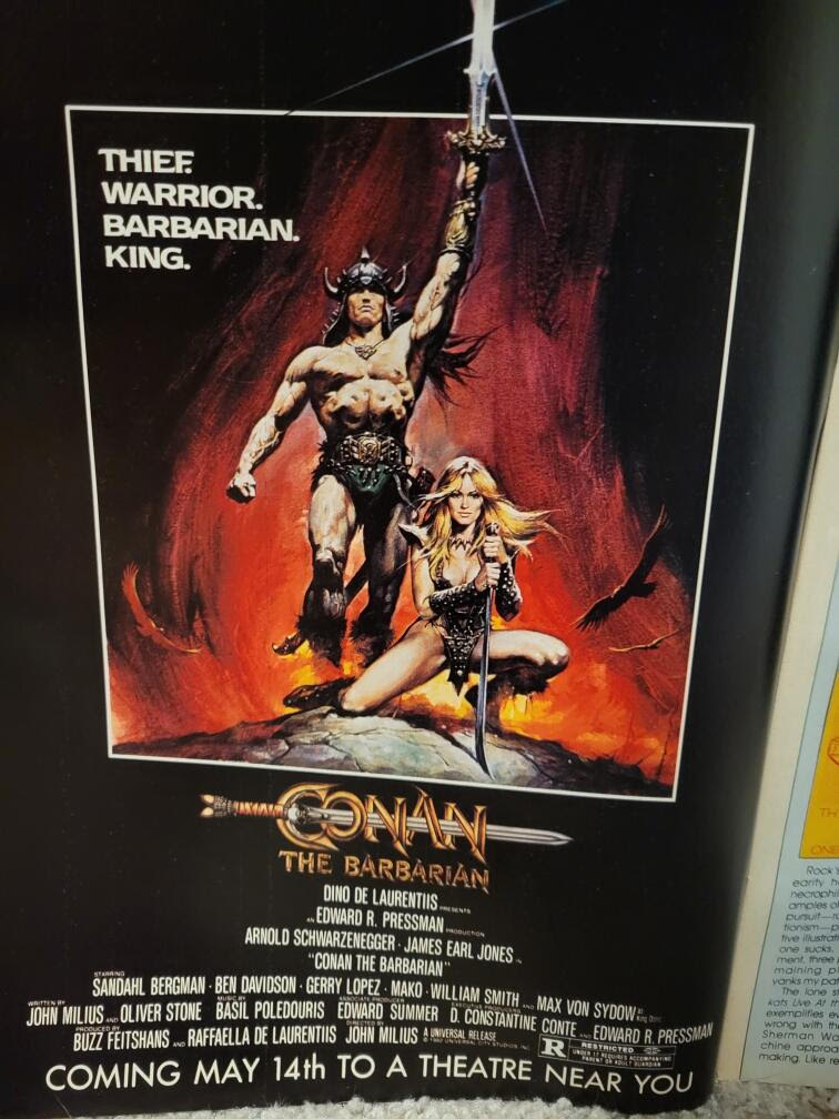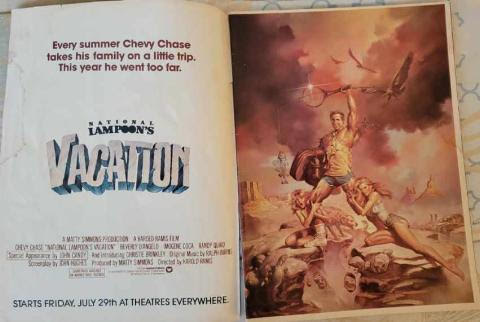 What really slayed me was the full-page ads for some of my all-time favorite movies: Blade Runner, Excalibur, the original Conan the Barbarian, Twilight Zone: The Movie, even the first Vacation film. Again, no surprise in the latter case, which ran a two-page spread with Chevy Chase as a nutty yuppie champion of the wasteland theme. The recognizable movie poster was helmed by fantasy art royal, Boris Vallejo, whose covers for Heavy Metal were always mandatory pickups for me.