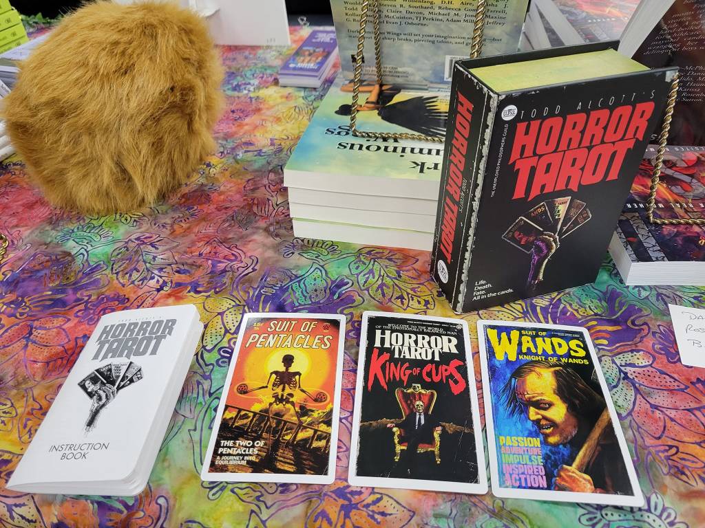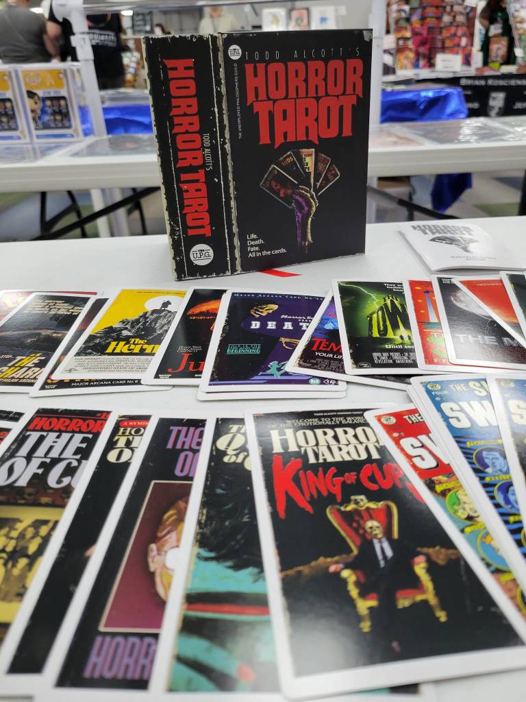 My favorite score at Shore Leave 44 aside from a couple of rad Godzilla books and a dude peddling some delicious smelling gamer-themed coffee beans, Todd Alcott’s incredible Horror Tarot deck. I don’t know what’s cooler, the beat-up paperback look to the packaging or the cards themselves, representing the arcana spanning the 1920s through the Eighties homaging classic horror movie posters, book, magazine and comic covers. If you know me, it’s no surprise the divine drew me two Stephen King cards, but the draw three was the exact answer I hoped for.