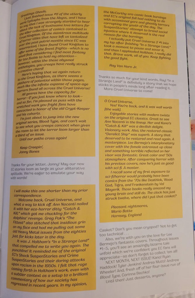 Four: For the fourth time this year and sixth overall, I had my letter published in a comic, this time Cruel Universe Vol. 2 Issue 4, released last week. To get my name in a comic book as a writer, THAT’S the mission. Still, beyond grateful to the industry for kindly printing my thoughts. Meanwhile, look at that sick cover from Lee Bermejo, probably the top talent cover artist in the game.