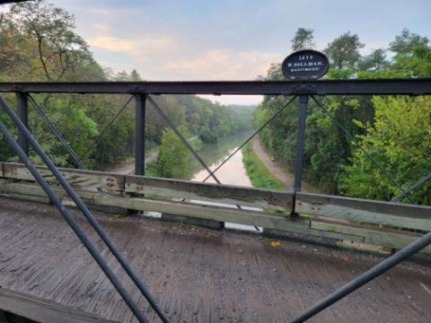One of the most remarkable structures I found while exploring this canal town after picking up my race packet and shirt (unlike Spartan and DEKA, everyone else gets their event shirt before starting, usually in the interest of promotion and photo ops) was one the few remaining Bollman Iron Truss Bridges left in the United States. Naturally I took two treks across the Bollman as well as the standard bridge where I met a local woman in the dark upon arrival to Williamsport at 6:25 a.m. who was walking her dog. We chatted all the way across to the Cushwa Basin before parting ways. An iron truss “River Rat” in her own right, the senior woman told me she’d just been in the hospital the week prior with kidney stones. You’d never know it by the way she kept pace with me and kept her excitable, barking four-legged pal in check. A Spartan AROO! cheer goes to that old gal.